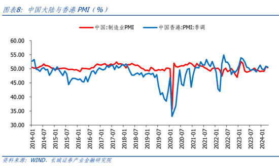 中上游仍然有捏续复苏的能源。本年的内行营业环境呈现出制造业趋于复苏和“常态化”的趋势,弘扬为制造业与服务业PMI之间的差距渐渐缩小,以及可营业商品部分的增长速率正向举座经济增长速率迫临。凭据世界营业组织(WTO)在2024年4月发布的最新瞻望敷陈,揣摸本年内行货品出口总量有望已矣2.6%的同比增长。从内行制造业的复苏态势来分析,内行制造业PMI本色上揭示了内行经济中具有营业属性的部分对居品和服务需求的喜悦进度,且这一计算与我国出口增长速率之间存在着纷乱的对应相干,因此我国的制造业可能会捏续收益。